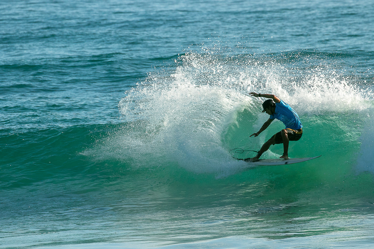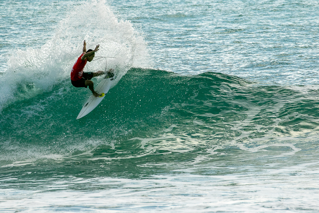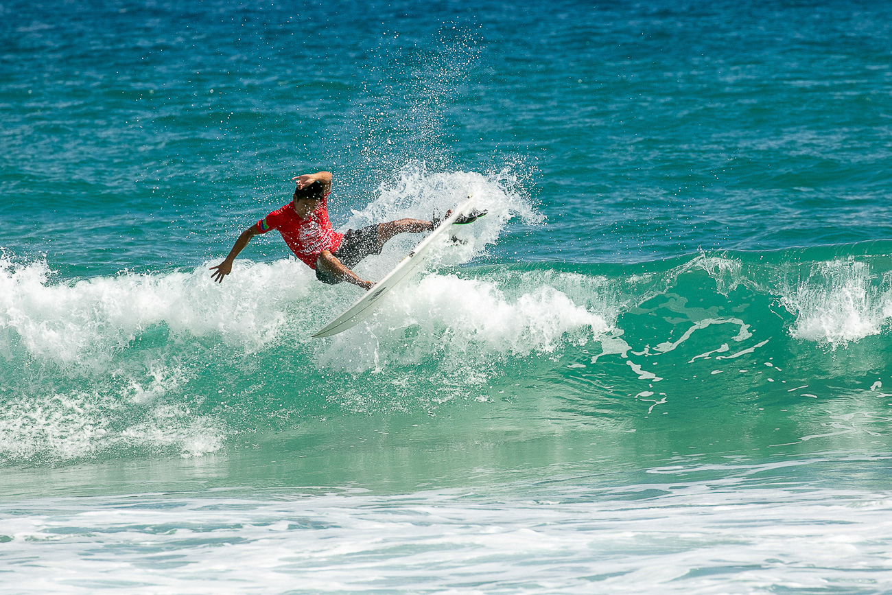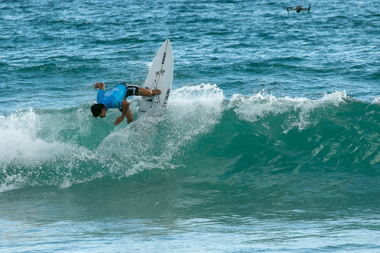 序盤から須田が安定したサーフィンで4.17をスコアし、続いて5.10を加えヒートをコントロール。中盤、岡野が4.13で2位に浮上するが、山中が直後に4.93をマークし逆転。川俣も果敢に攻めたがフィニッシュに苦戦。終盤には須田がキックリバースを成功させ差を広げ、須田と山中が勝ち上がった。