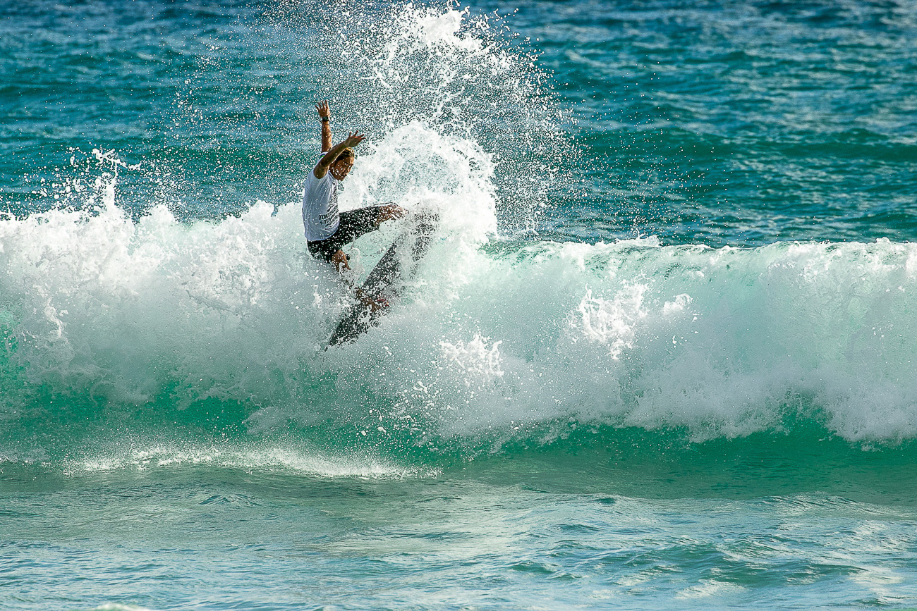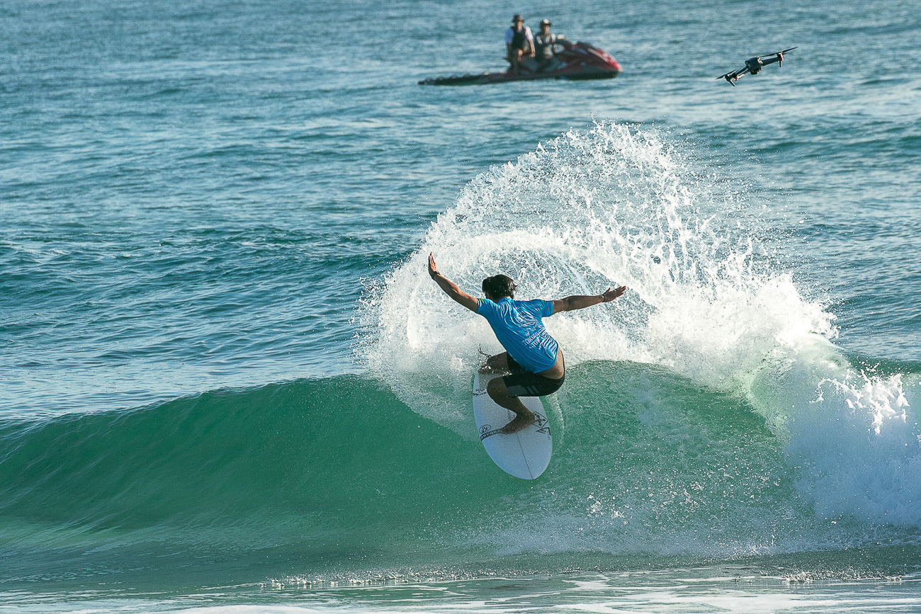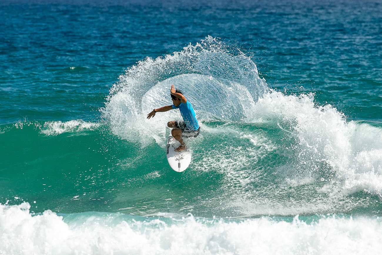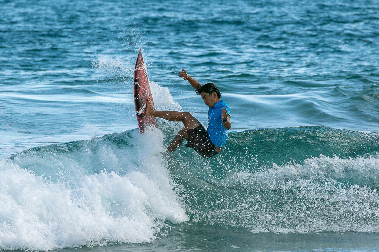 第4ヒートは岡村コウスケ vs 須田喬士郎。序盤はスコアが伸びず膠着状態が続いたが、岡村が形の良い波で4.10を決めて主導権を握る。さらにバックサイドのリッピングで4.57を加点しリードを広げる。須田も攻め続けたが決めきれず、岡村が勝利。