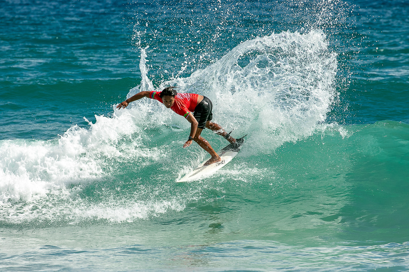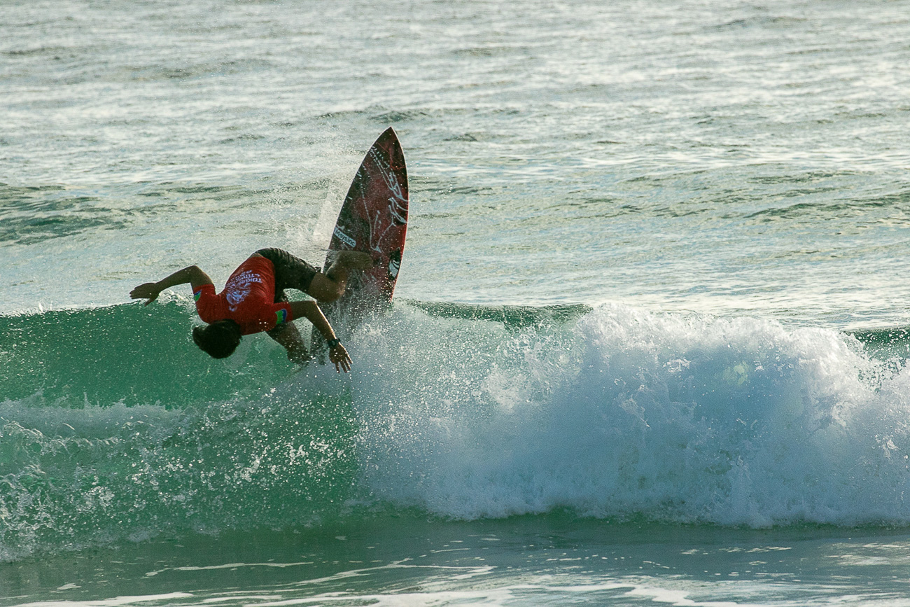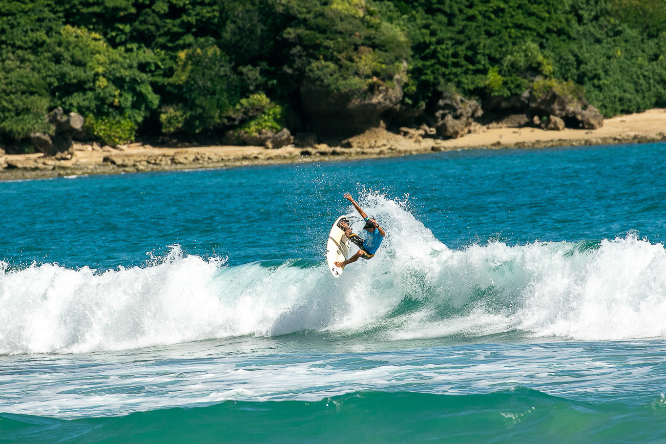大会2日目の朝は、美しい朝日とともに幕を開けた。予報に反して風はオフショア。サイズも少し上がり、胸~肩、時折それ以上の波がコンスタントに押し寄せる。アウトからインサイドまで2~3発のターンが入る波が届き、会場には初日以上の期待感が漂った。