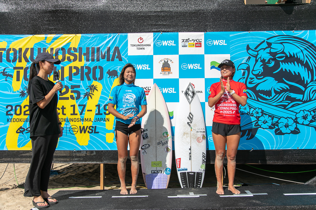 Heat1は、今シーズン好調を維持する川瀬心那と、徳之島を地元とする青山コト。観客席には青山の仲間や家族、町の応援団が多く詰めかけ、地元選手への声援が一際大きく響いた。先に仕掛けたのは青山。レフトの波をインサイドまで丁寧につなぎ1.43をスコアし、会場から拍手が起こる。続いて川瀬がライトをキャッチし、スピードに乗ったターンで4.00をマーク。その直後、アウトからレフトを捉え、ターンを繰り返しインサイドまでつなぎ切ったライディングで6.67という高得点を叩き出す。青山も地元の意地を見せるようにレフトに乗り返すが、1.30止まり。残り3分、川瀬がライトでバックサイドの鋭い1発を決め、4.07を追加。最終的にトータル10.74で川瀬が快勝。敗れた青山も堂々の3位に輝き、会場は大きな拍手と地元ならではの温かい空気に包まれた。