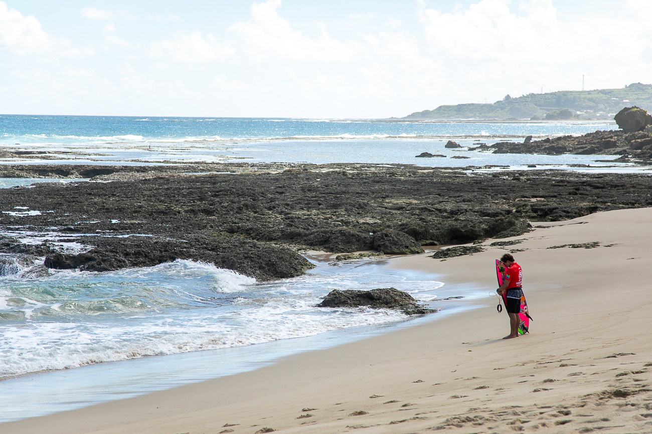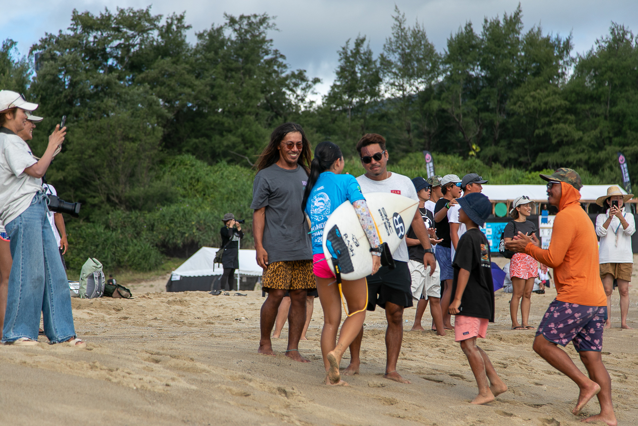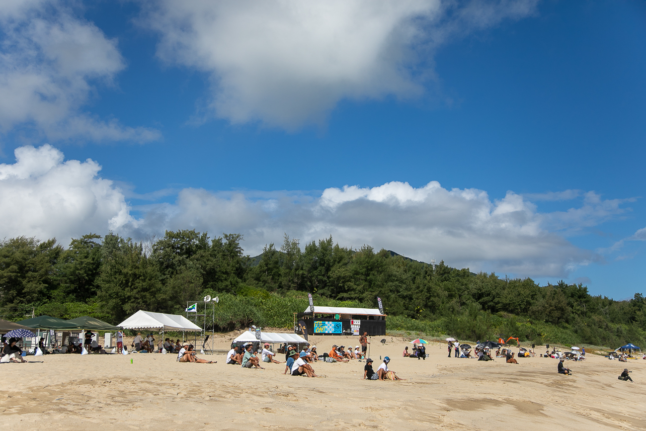 朝の満ち込み時は、真ん中を流れるカレントを境に右側で割れるライトが勝負の場になっていたが、この日はカレントの沖からつながる波がインサイドでリフォームし、長く乗れるコンディションへ。さらに会場右側のレフトもフェイスの張る波が続き、しっかり選べば2~3ターン、特に大きな2ターンを入れることが勝敗の鍵となる展開が予想された。ギャラリーも「今日はドラマが起きそうだ」と期待に胸をふくらませていた。